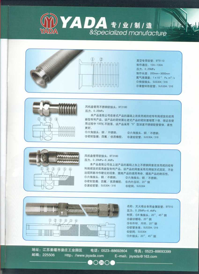 秉天時(shí) 籍地利 仰人和 虔誠一個(gè)永恒的理念,創(chuàng)新永續(xù).百諾不如一信,亞達(dá)人堅(jiān)持以信為本,視客戶如同上帝,把對(duì)信譽(yù)的追求,體現(xiàn)在嚴(yán)格的質(zhì)量控制和完善的客戶服務(wù)上,讓客戶百分之百滿意是亞達(dá)人不變的信念。 本廠系ISO9001質(zhì)量認(rèn)證企業(yè)、計(jì)量合格企業(yè)。本廠專業(yè)致力于生產(chǎn)不銹鋼金屬波紋軟管、超高壓、高壓膠管、波紋管補(bǔ)償器(膨脹節(jié))、立式、臥式、冷卻器。本廠產(chǎn)品具有承受壓力高、彎曲半徑小、抗疲勞性能強(qiáng)、使用壽命長等特點(diǎn)。廣泛應(yīng)用于電力、石化、冶金、水泥建材、工程機(jī)械、礦山及液壓系統(tǒng)。產(chǎn)品暢銷全國各地。 今日亞達(dá)之成功源自諸多客戶的厚愛,明天的輝煌更離不開您對(duì)我的支持與信賴。查看更多>>